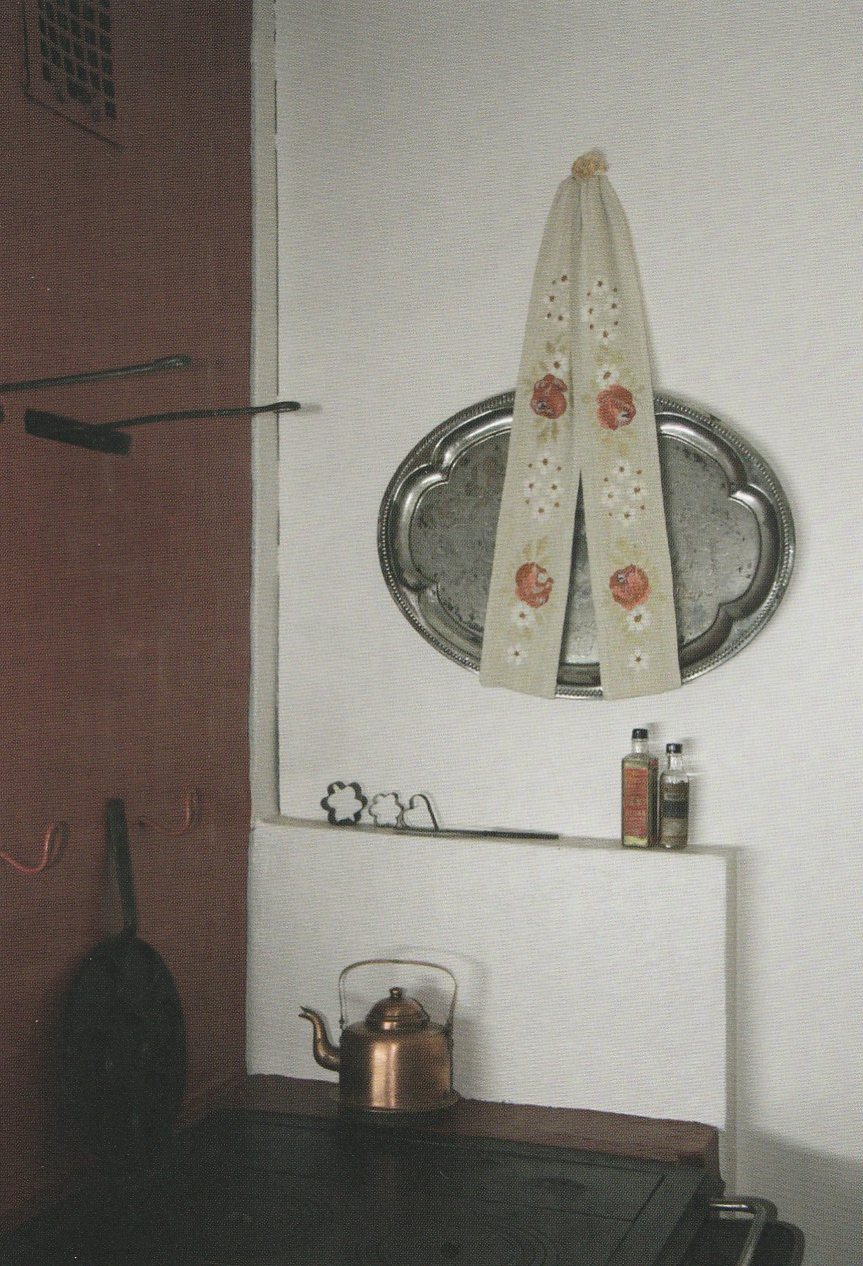 Tarjotin peitettiin usein vuoden aikaan sopivalla liinalla. Tämä liina laitettiin tarjottimelle juhannuksena, sen on kirjonut Annikki Saalasti.
